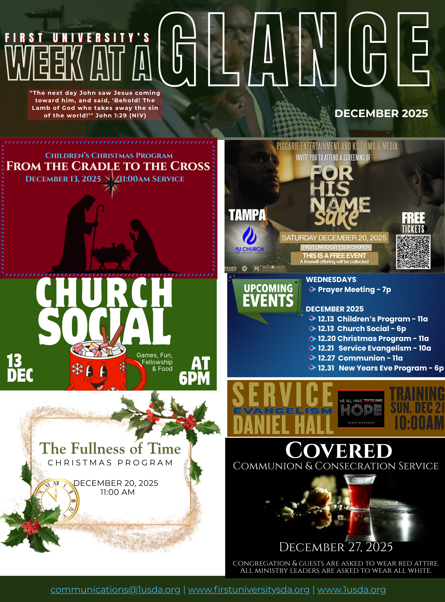 Welcome to First University Seventh-day Adventist Church in Tampa, Florida. We are a congregation that believes in Loving Intentionally, Teaching Truthfully, and Worshiping Fervently.